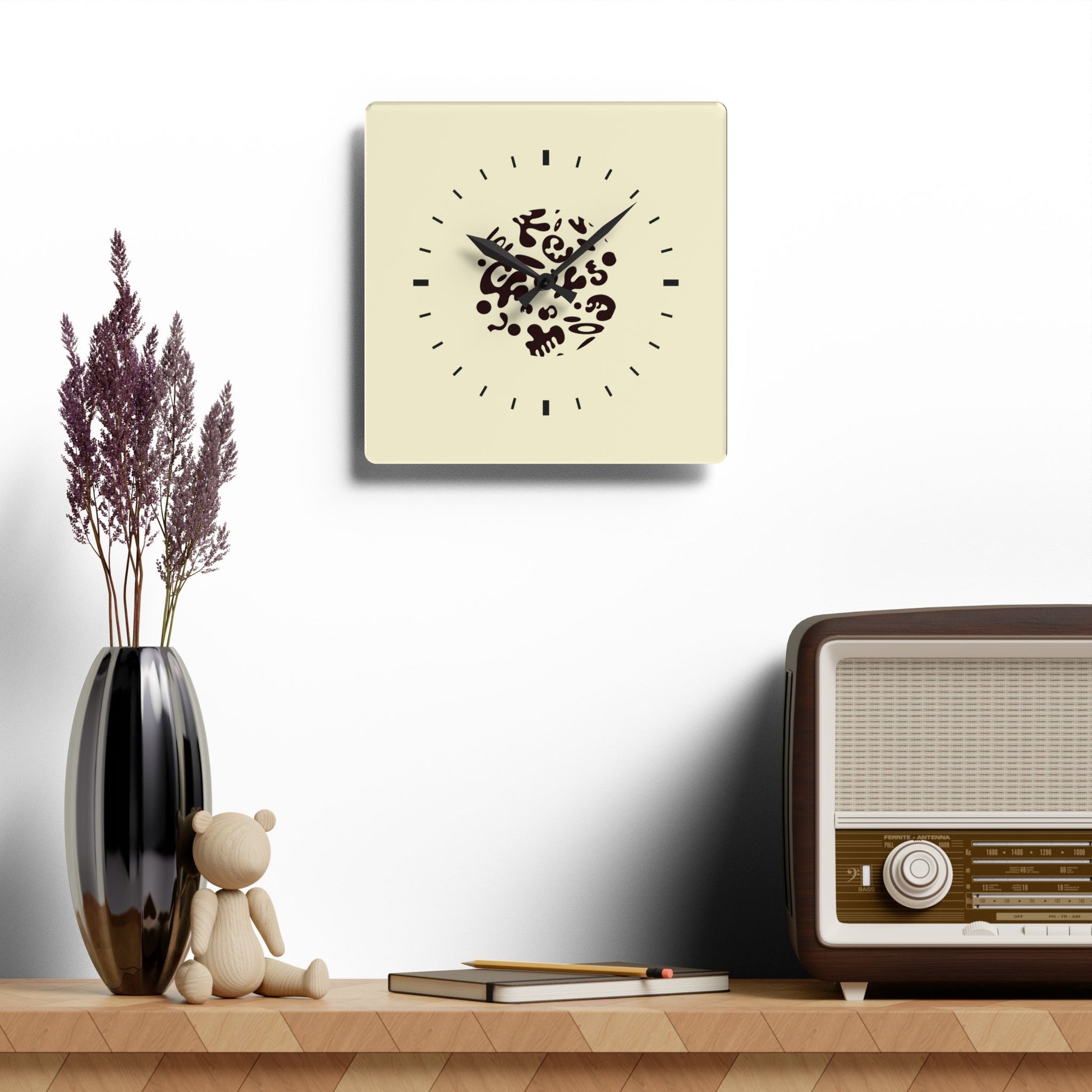 These clocks come in two shapes (round and square) and two sizes. Each clock has a keyhole at the back for easy hanging on a wall. They're made from an acrylic material that looks like glass but is more durable and sturdy.